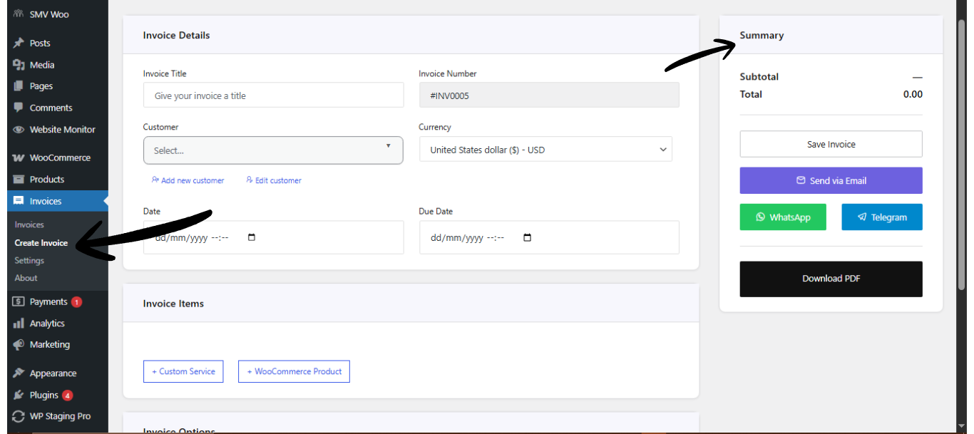After activating the plugin, a new Invoice menu will appear in your sidebar.