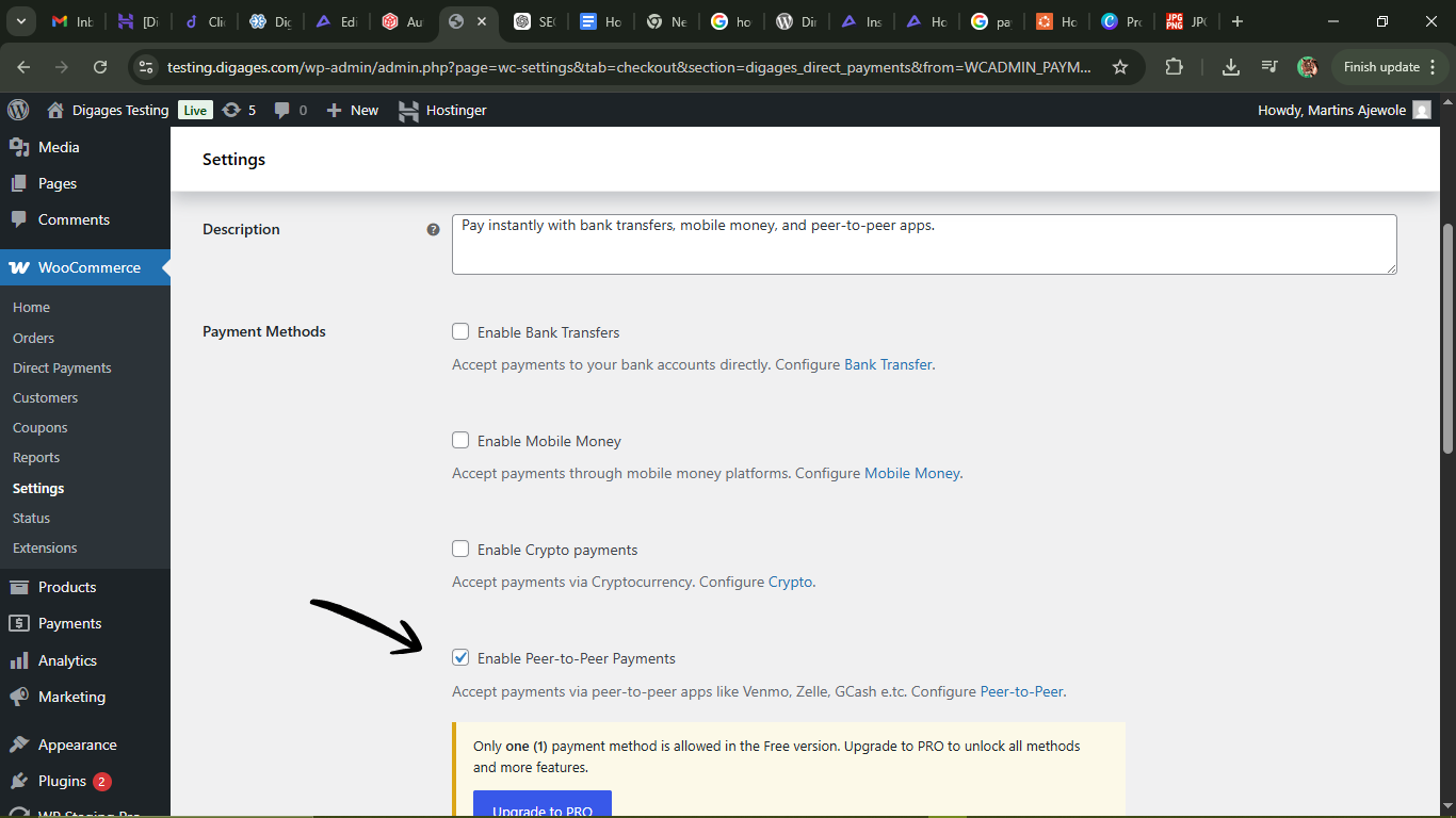 1. On your WordPress dashboard, navigate to WooCommerce → Direct Payments → Settings