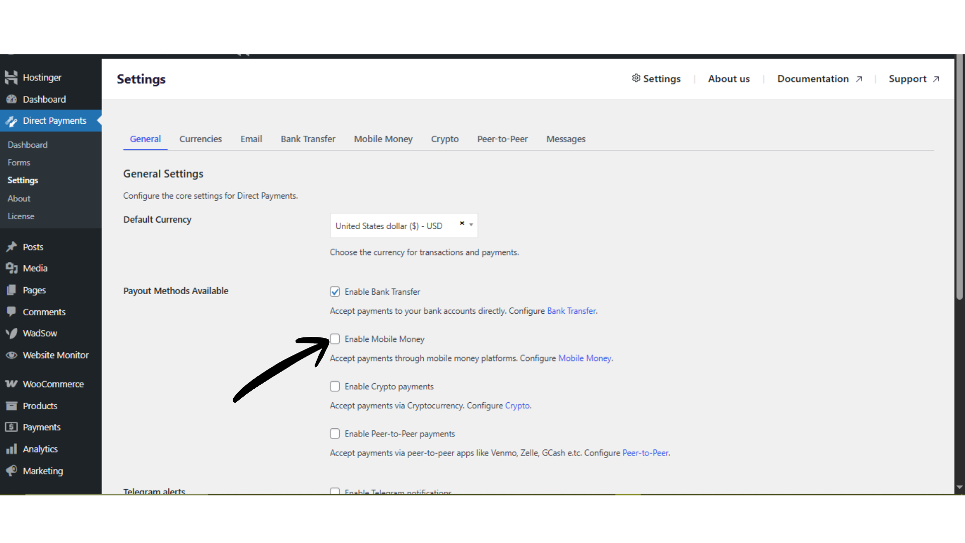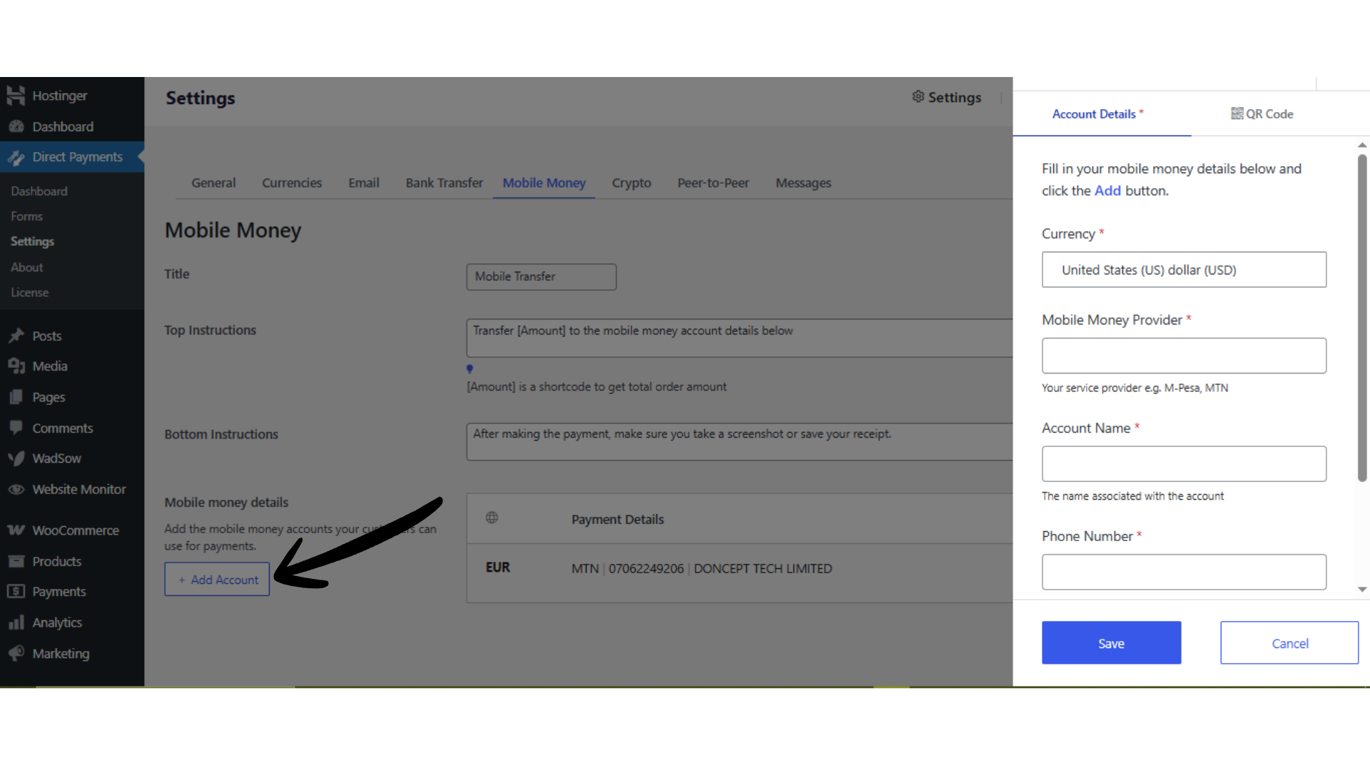 Navigate to Direct Payments WP → Settings → Mobile Money.